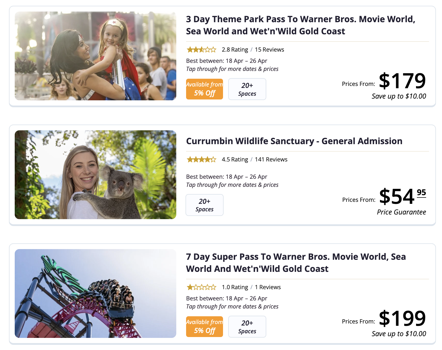 호주에서 많은 여행 상품과 티켓을 판매하는 북미에서 찾아보니 위 테마파크 공식 가격과 동일합니다.