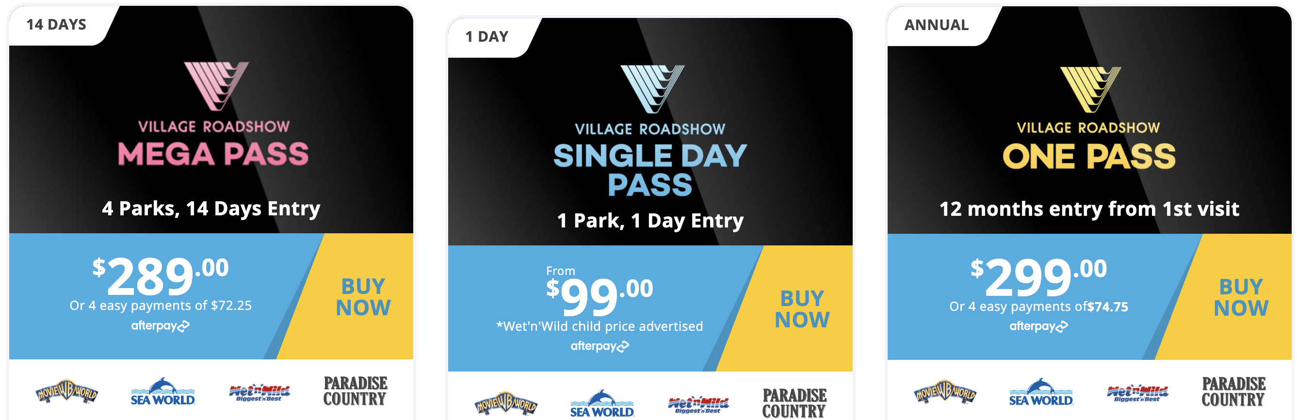 우선, 성인과 어린이의 가격은 동일합니다. 퀸즐랜드와 뉴사우스웨일스 북부에 거주하는 사람들은 LOCALS를 통해 12개월 티켓 구매를 고려할 수 있지만 골드 코스트 관광을 위해 온다면 Movie World, Sea World, 그리고 웻앤와일드. 가는 $179가 가장 많은 픽업인 것 같습니다.