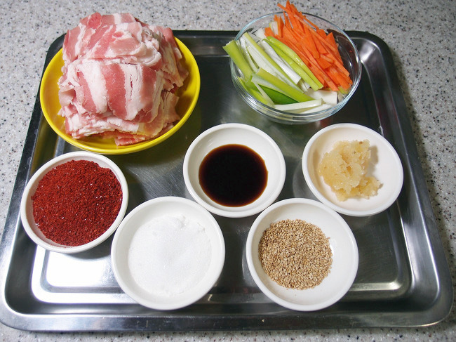 - 돼지고기를 먹기 좋은 크기로 썰어 소스와 버무린다. (고추장, 파프리카가루, 간장, 설탕, 참기름)