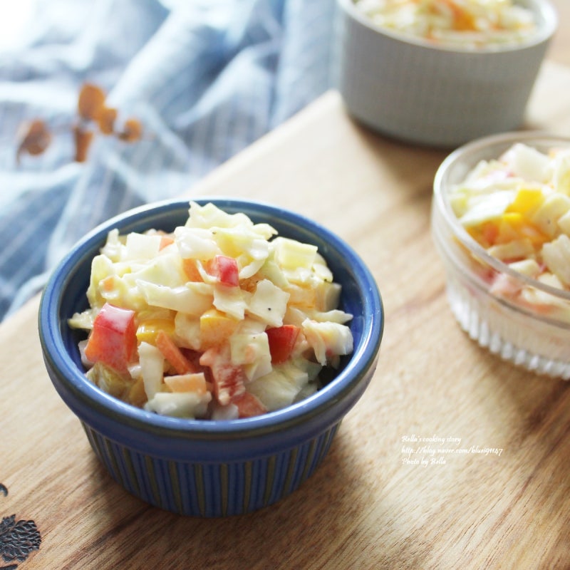 좋은 아침, 주말은 어땠어? 남편과 저는 몸이 좋지 않아서 몸에 좋은 음식을 먹고 푹 쉬었습니다. 나는 식사 계획을 세운다. 코울슬로가 제일 쉽고 맛있지 않나요?오랜만에 만들어본건데 너무 맛있어서 접시 가득 채울정도로 맛있어요.식초를 넣은 물에 넣고 물기를 빼고 비벼주면 매운맛이 덜합니다.